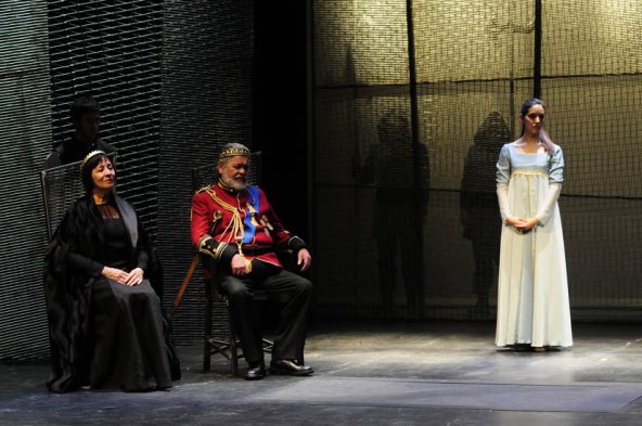 La obra estuvo excelente. Duró alrededor de 2 horas (tengo la impresión de que la obra fue adaptada para que su duración no se extendiera demasiado), en las que los actores representaron magníficamente la trágica historia. La escenografía era un enredo de fierros, que permitían crear espacios aislados dentro de la misma escena. Un panel móvil en el fondo permitía crear un pasillo trasero en el que se podían ver personajes transitar, y a veces, servía como puerta, para la entrada de ellos.